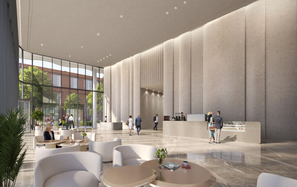 Инфраструктура. Первые 2 этажа здания занимает развитая коммерческая инфраструктура более 1 тыс. кв.м. и включает в себя – кафе, рестораны, столовую, магазины. В лобби на 1 этаже (потолки 6,5 метров) будет находиться кофе-поинт и зоны для проведения бизнес встреч.