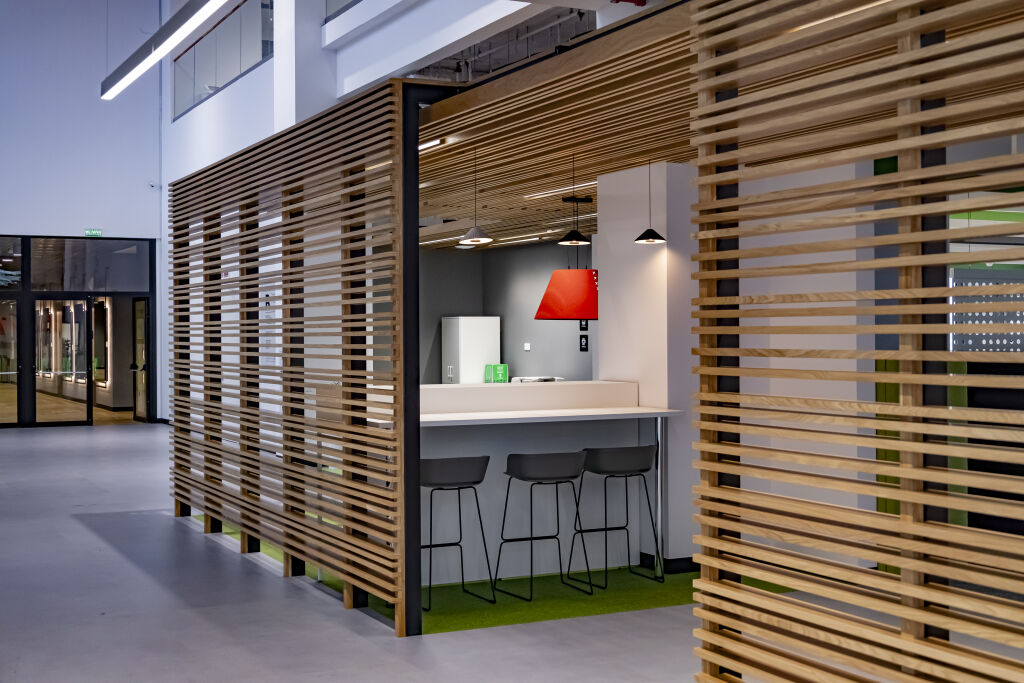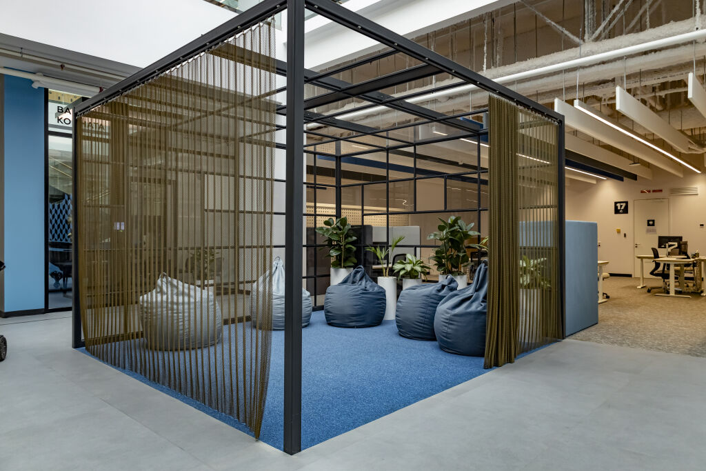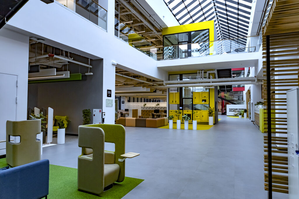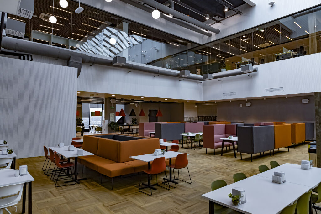 Рабочие места расположены на двух этажах с парящими лестницами для вертикальной коммуникации. Проектировщики уделили внимание акустическому комфорту, исключая визуальное перенаселение офиса и обеспечивая эффективную климатизацию. В офисе отсутствуют закрепленные места — сотрудники бронируют рабочие места через специальное приложение.  Предлагаются разнообразные варианты на выбор: стандартные места, столы с подъемным механизмом для работы стоя, а также закрытые места с дополнительной шумоизоляцией для тех, кто предпочитает уединение. В теплое время года доступна открытая веранда с видом на город. Мебель, установленная на террасе, — из магазинов «Лемана ПРО».